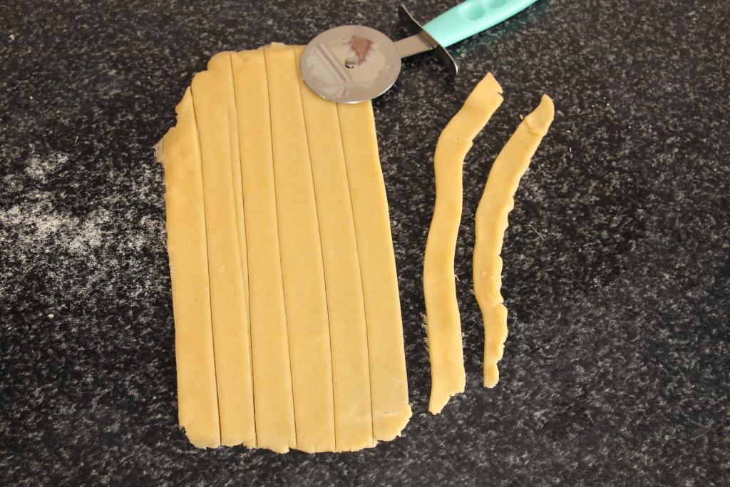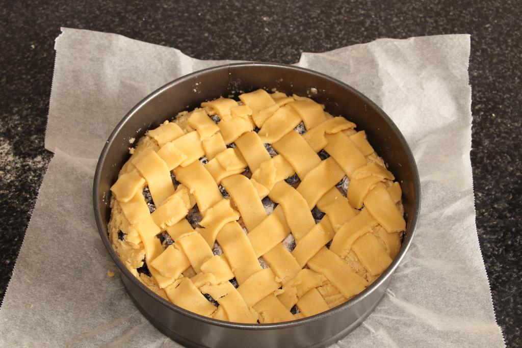 Volvemos a espolvorear la encimera con harina, colocamos el otro rulo de pasta quebrada y estiramos con el rodillo. Cortamos tiras largas (con un cuchillo o un corta pastas) de unos 2 cm de anchura. Las vamos colocando sobre la tarta formando un enrejado ( tiras cruzadas entrecruzdas).