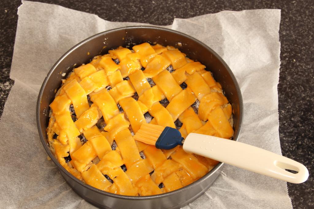 Batimos la yema de huevo y pincelamos todo el enrejado de la tarta.
