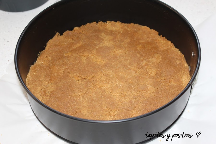 Ponemos esta mezcla sobre un molde redondo desmoldable y aplastamos con una cuchara o con el cubilete. Reservamos en la nevera.