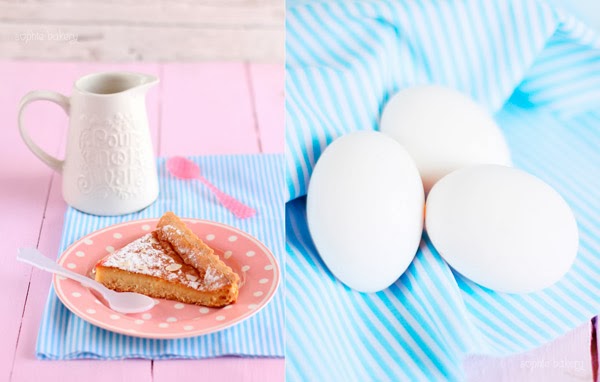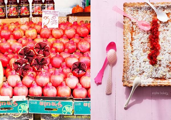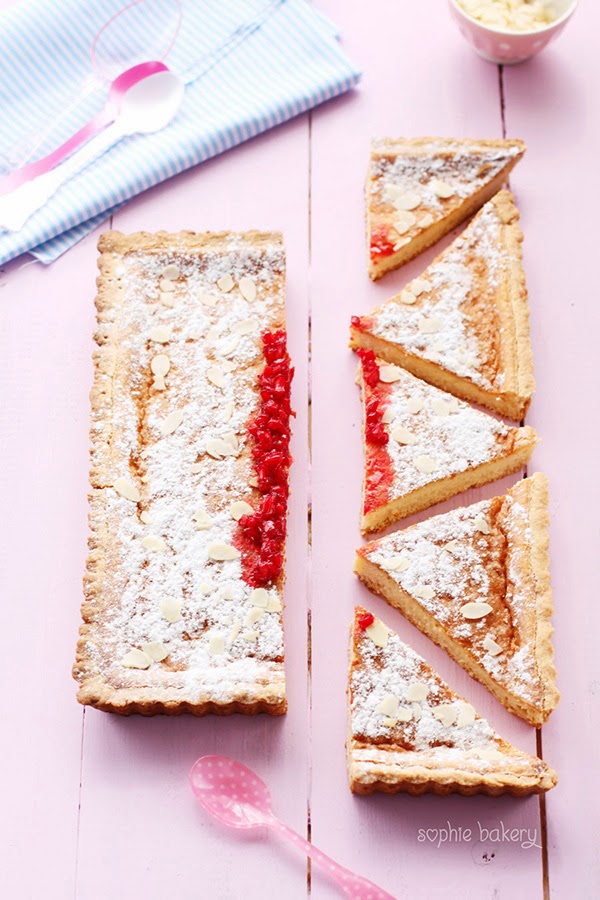 Una masa de galleta tierna...un interior de crema de arroz con leche y una cobertura de azúcar glas, almendras fileteadas y compota de granada...un vicio! No puedes tomarte solo un trozo!