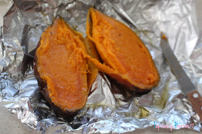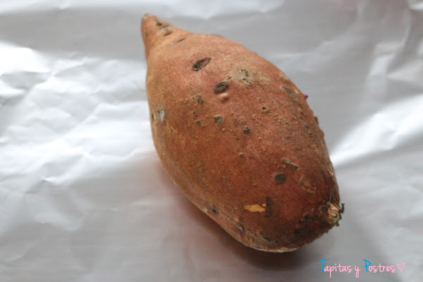 Lo primero que haremos es asar una batata. La liamos en papel aluminio y la asamos en el horno unos 45 minutos a 180º.