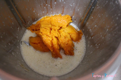 Agregamos el puré de batata, el zumo de mandarina y el aceite. Batimos 30 segundos a velocidad 4.