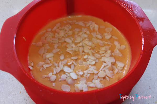 Vertemos la masa en un molde engrasado y espolvoreamos almendras laminadas. Horneamos 50 minutos a 180º.