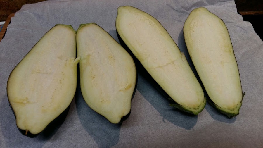 Cortamos las berenjenas por la mitad y la horneamos durante 35 minutos.