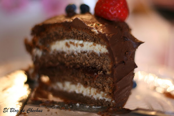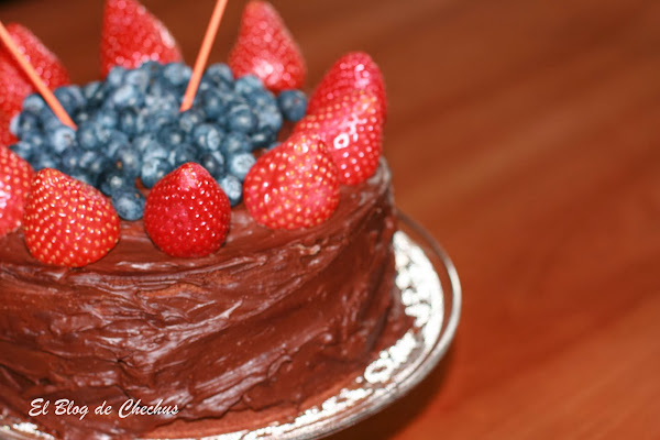 Ayer fue mi cumpleaños, y como no, tenia que auto regalarme una tarta. Mi amiga Vicen me había dado la receta de un bizcocho con yogurt griego que tenia muchas ganas de probar así que, aproveché la ocasión. Por dentro, a capas, de una crema de mascarpone, rica no, riquísima!!!! y mezclada con otra de mermelada de fresas. Para rematar la ingesta de calorías a go go, la termine con el ganaché de chocolate negro , y para aligerar un poquito ( ja, ja) unas frutas , fresas naturales y arándanos.