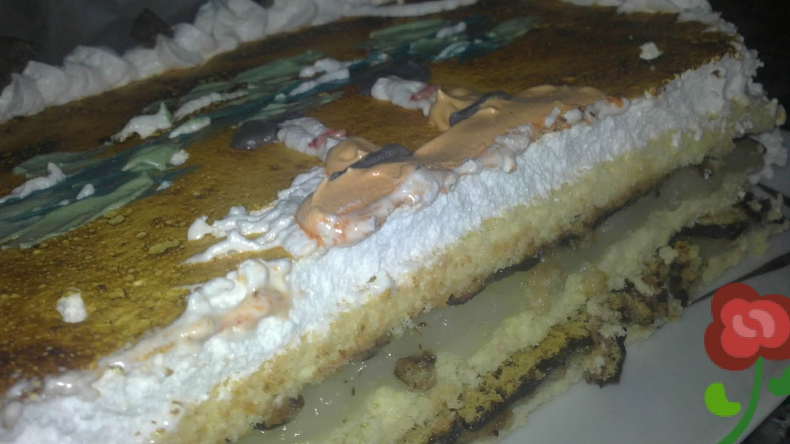Es una tarta muy simple con bizcocho, crema y chocolate, de merengue y con esta decoracion para todas las edades, en concreto fue para mi madre, en su dia, Santa Elisa.