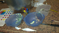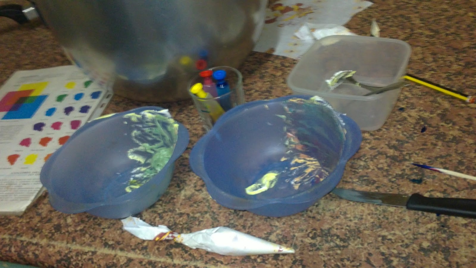Y para el dibujo con merengue te hacen falta colorantes alimentarios de varios colores, varios tazones para mezclar los colores, varios conos de papel para usarlos como lapiz... Un modelo... Y cuando acabes el dibujo, acaba de poner el merengue en los lados de la tarta.