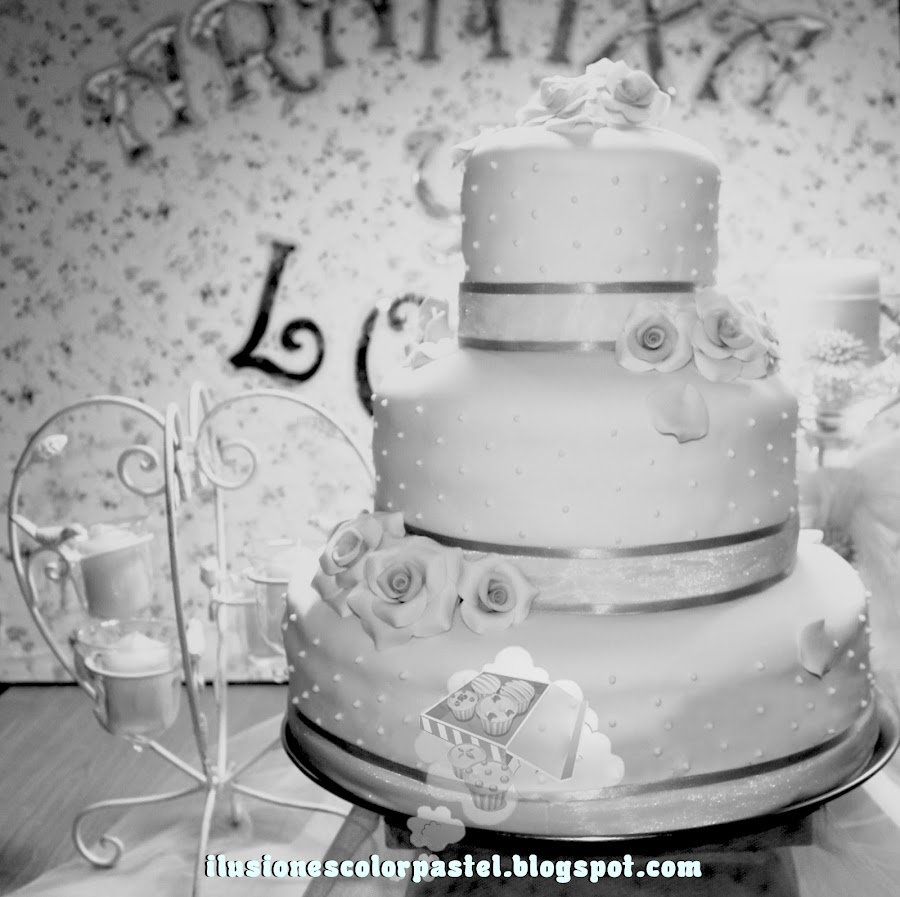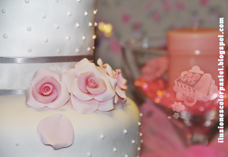 Poco a poco la receta añorada de Loïc fue cogiendo forma de pastel de boda... Fondant Credi Paste, lazo de organza, rosas de pasta de goma Ballina y perlitas hechas con boquilla 2M de Wilton y glasa real.