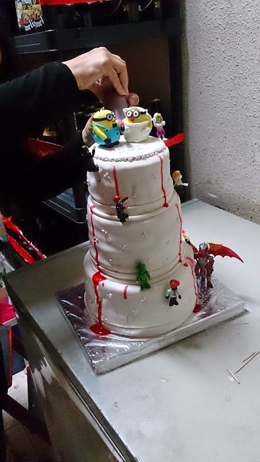 ?El otro se casaron unos amigos y me pidieron que les hiciera la tarta. Lo tenían muy claro, de tres pisos, blanca, bizcocho rojo, rellena de chocolate y los novios iban a ser una pareja de Minions. Además iban a coger unos adornos un tanto especiales para adornarla y querían que pareciera que chorreaba sangre.