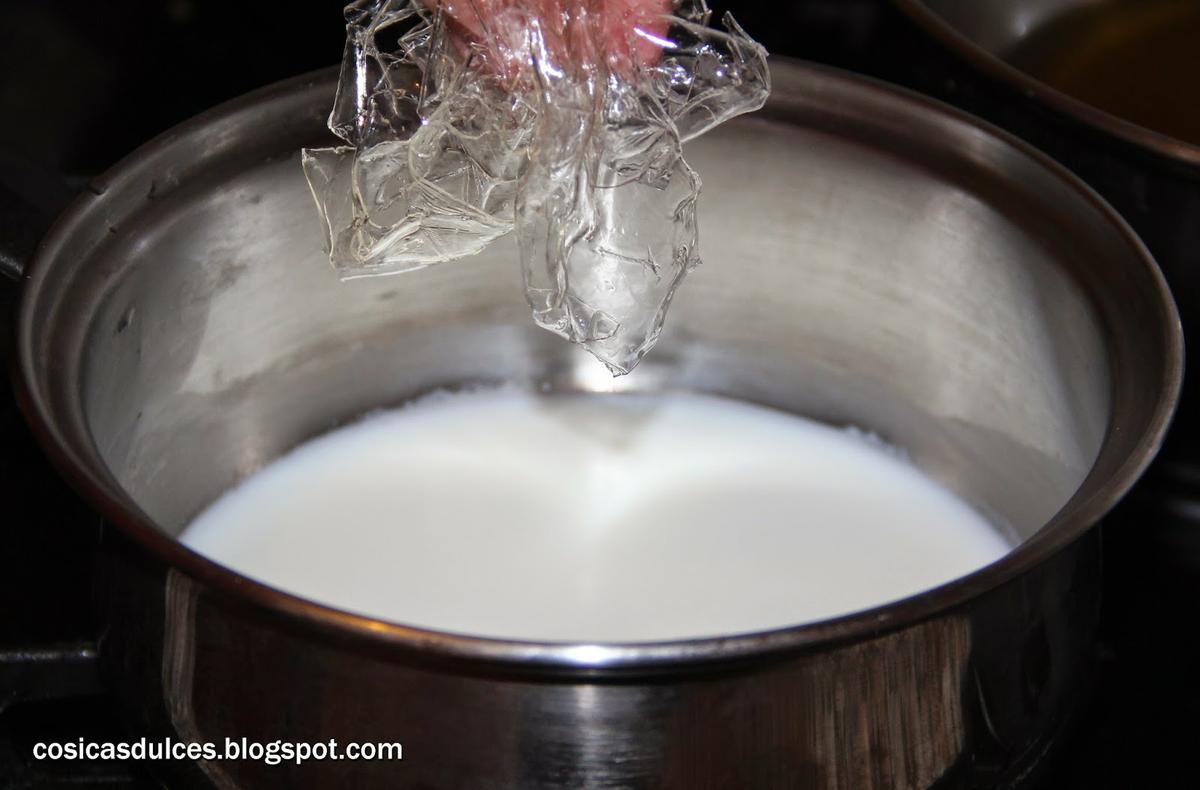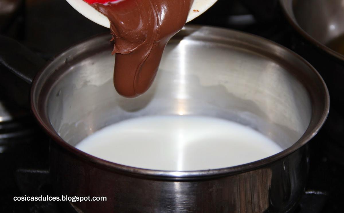 Mientras se enfría el brownie procedemos a preparar el mousse de Nutella. Para ello calentamos la leche (sin excedernos). Una vez caliente y ya fuera del fuego disolvemos en ella la gelatina que previamente habremos hidratado en agua fría.