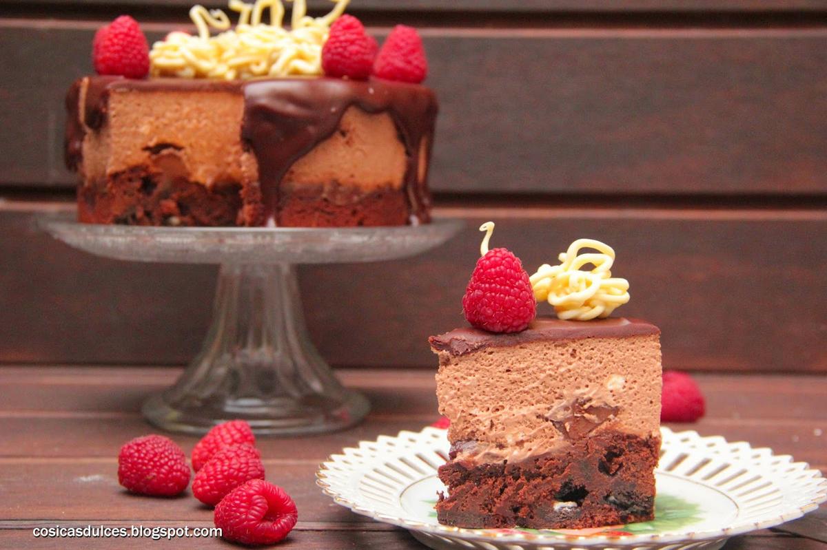 Al día siguiente la desmoldamos y la cubrimos con la ganache de chocolate. Para hacer la ganache tenemos que calentar la nata (crema de leche) y cuando rompa a hervir verterla sobre el chocolate blanco y el negro que tendremos bien picaditos en un bol y que se derretirán con el calor residual de la nata (crema de leche). En el centro unos nidos de chocolate blanco y unas frambuesas. Y listo.