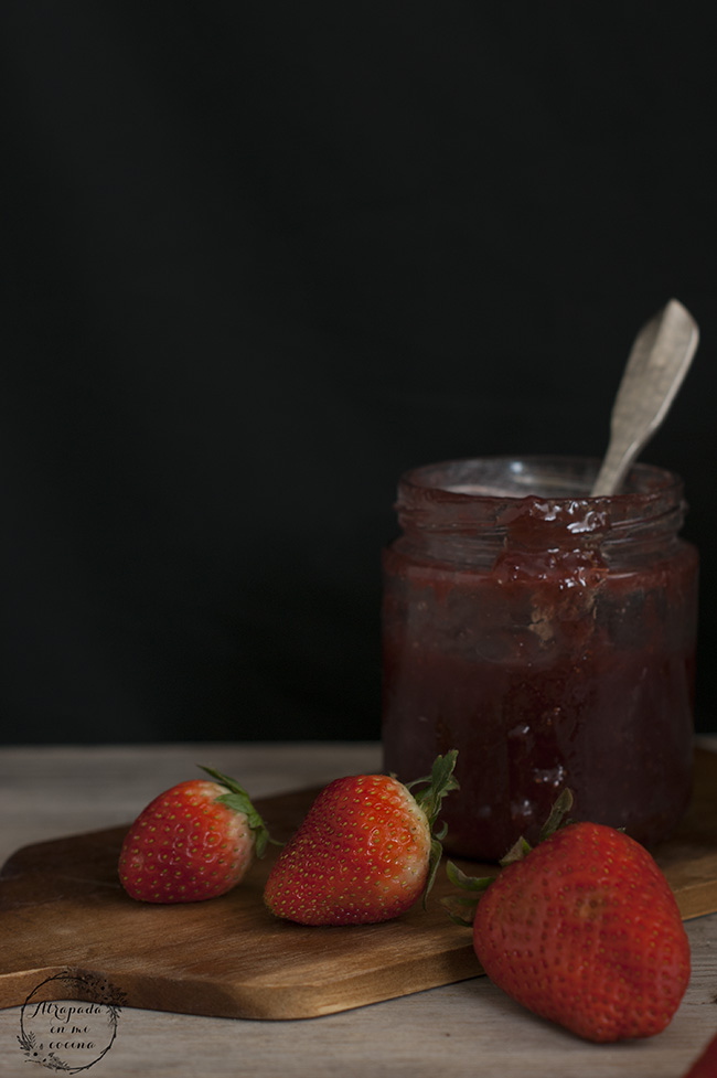 Sacamos una vez cuajada. Desmoldamos y añadimos una fina capa de mermelada y decoramos con unas cuantas fresas bien lavadas.