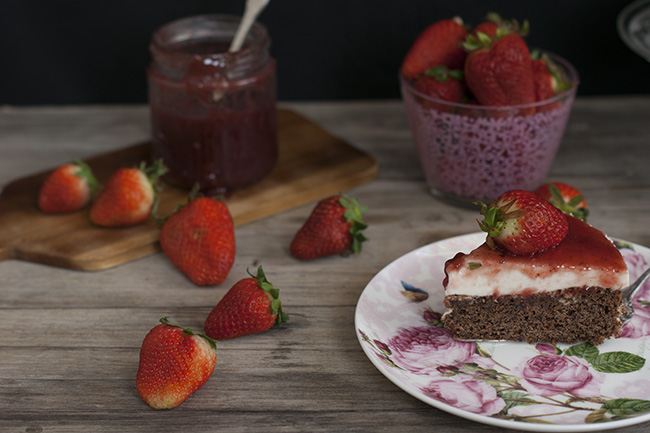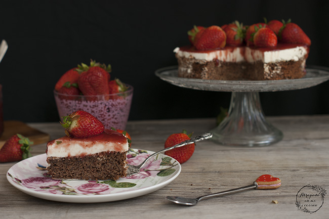Las fresas dan mucho juego en mi cocina, y es que en temporada siempre tengo en casa, y si no hay suerte y no están muy buenas acaban convirtiéndose en mermelada. Y unos cuantos botes tenía de mermelada casera de fresas cuando pensé en hacer esta tarta. Mi intención era que la capa de brownie fuese del mismo tamaño que la de queso, pero adaptando cantidades de otras recetas al final quedó la parte de brownie más grande que la de tarta de queso. Pero si os gusta la combinación podéis usar un molde de 22 cm (el mío era de 18), por ejemplo y mantener la misma cantidad de brownie y doblar la de tarta de queso. Tanto la capa de brownie como la de queso están hechas con la Thermomix, no así la mermelada que prefiero siempre hacerla de forma convencional y de la que tenéis la receta aquí.