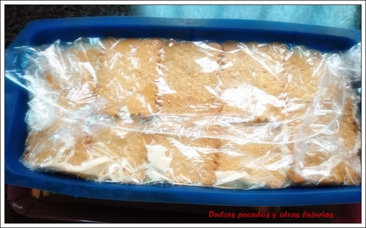 Ponemos en el molde una capa fina de crema de café, una capa de galletas mojadas en leche, otra capa de crema, otra de galletas... Así hasta que acabemos, siendo la última capa de galletas.