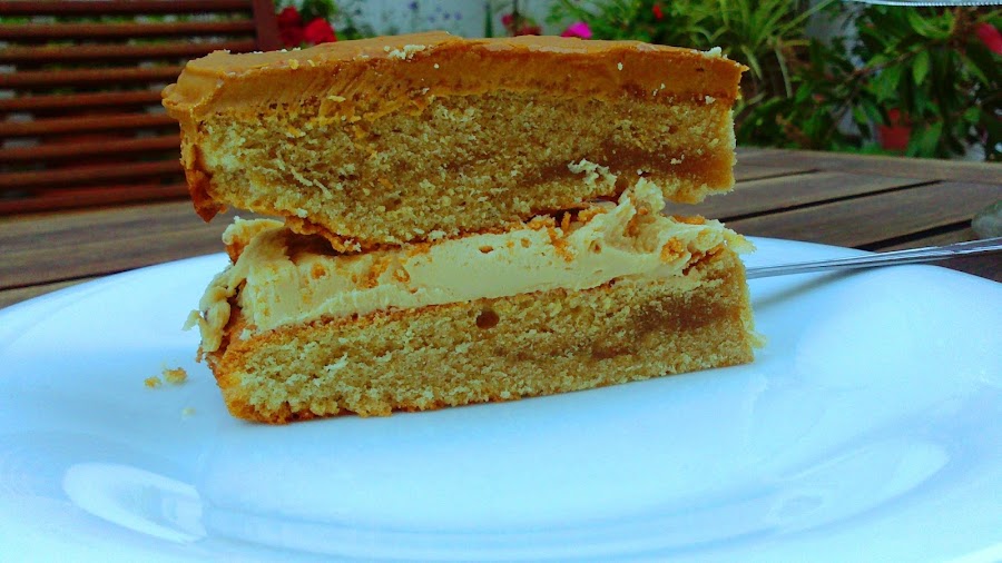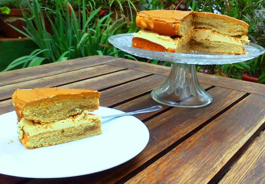 En otro recipiente pondremos lo que nos quede de café junto con lo que nos quede del azúcar glass y batiremos con las varillas hasta obtener una consistencia de pomada que nos permita untar el bizcocho por encima. Si está un poco líquido añadimos más azúcar glass, si está demasiado espeso añadimos un poquito de agua. Esto será nuestra superficie. El icing que se llama.