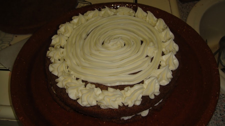 Para la decoración, ponemos una capa del bizcocho, y vamos haciendo copetes alrededor, y en el centro repartimos la crema con una espiral, así con las dos capas, y en la parte de arriba hacemos los copetes y con ayuda de un cuchillo los extendemos hacia el centro.