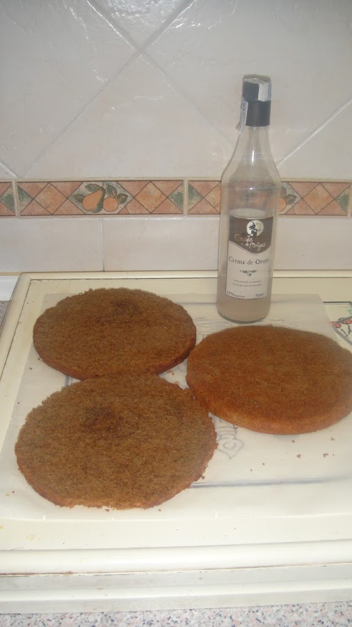 Para el almíbar ponemos los ml de agua a calentar en el microondas hasta que comience a hervir, una vez fuera añadimos el azúcar y la cucharada de crema de orujo y removemos bien.Con una brocha extendemos el almíbar por todos los bizcochos empapándolos bien.