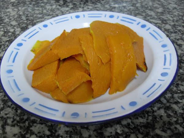 Pelar la calabaza y cortarla para poner en la bandeja del horno y asar, hasta que quede tierna y un poco dorada.