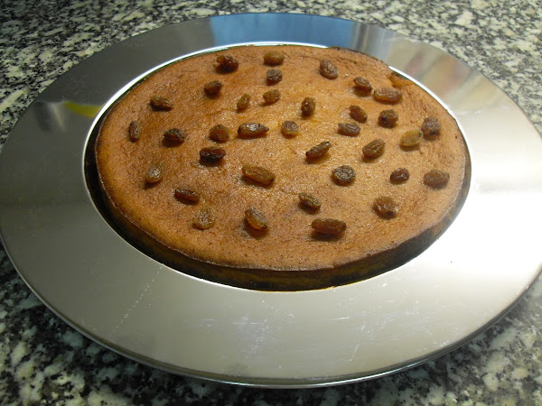 Sin casi sacar la tarta del horno apagado, colocar las pasas escurridas, y cerrar la puerta del mismo unos minutos con el calor residual.