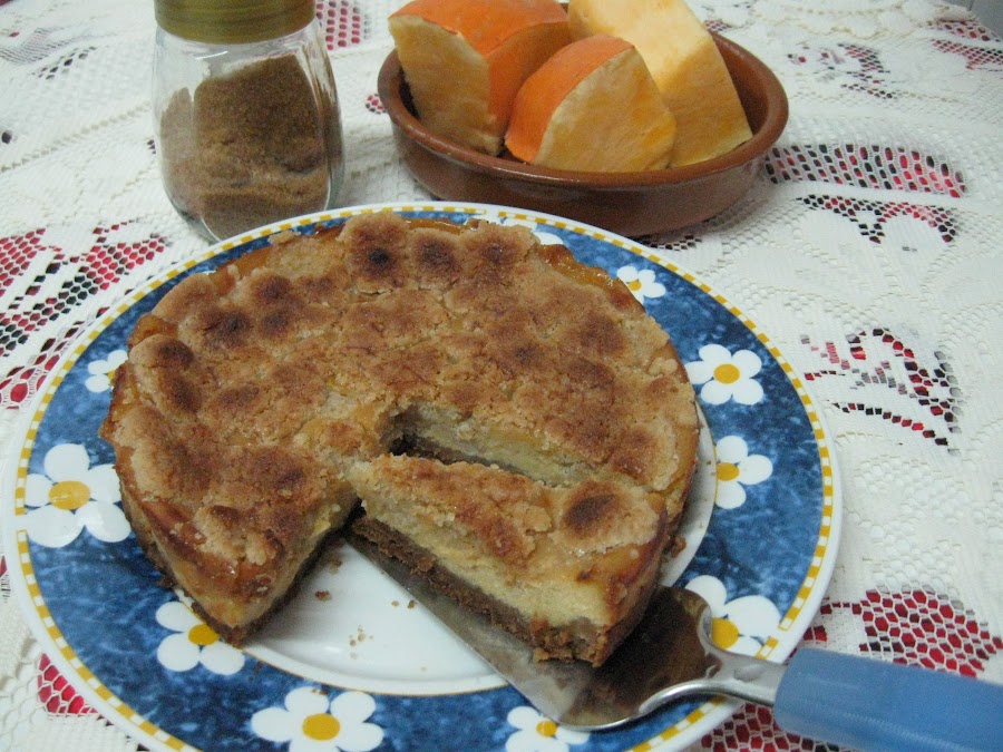Vertemos la crema de calabaza sobre la base de galletas y metemos en el horno precalentado a 180ºC unos 30 o 35 minutos (o hasta que veamos que empieza a cuajarse la superficie).