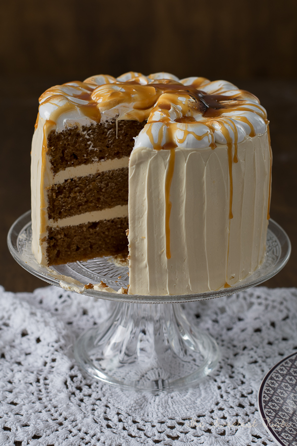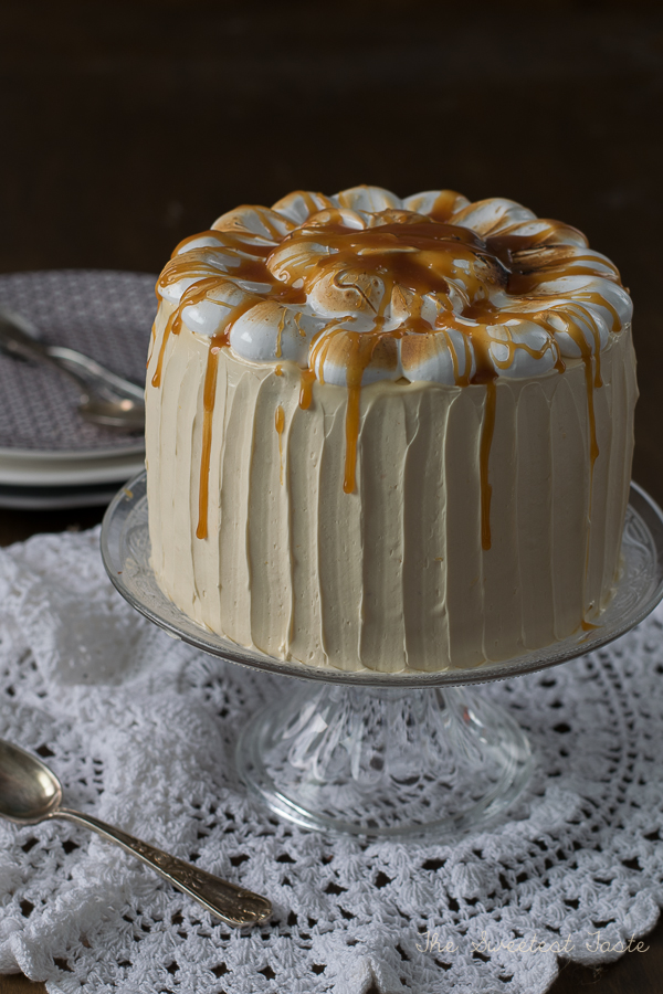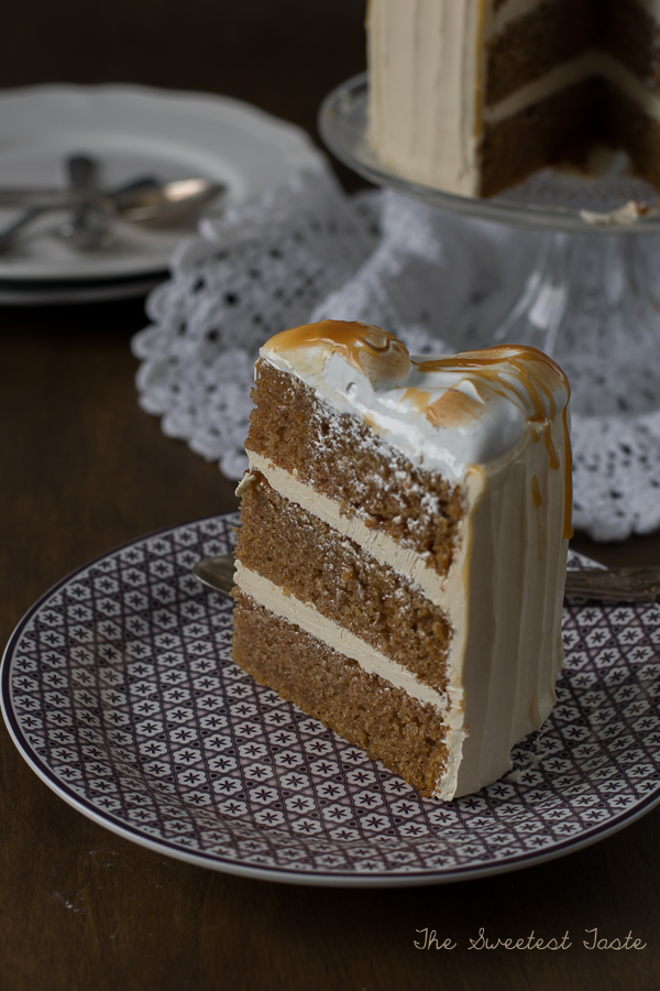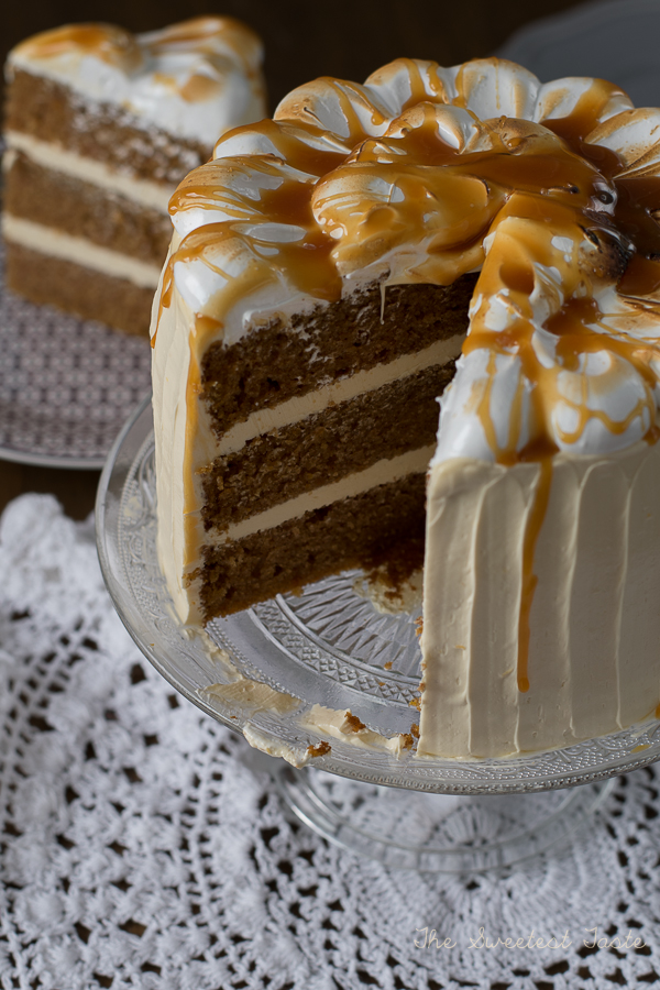 Para montar la tarta, igualaremos los bizcochos si fuera necesario. Colocamos el primer bizcocho sobre el plato de presentación y a continuación una porción de crema. Seguimos con el segundo bizcocho y más crema. Terminamos colocando el último bizcocho y cubriremos la tarta con una capa muy fina de crema para sujetar las migas. Refrigeramos la tarta unos 15 minutos. Ponemos una capa de crema más gordita y decoramos al gusto. Ponemos el merengue sobre la tarta y quemamos con cuidado con un soplete de repostería. Terminamos echando caramelo por encima.