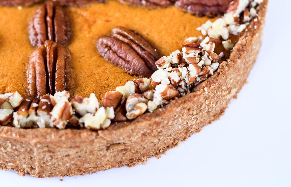 Tarta de calabaza y nueces pecan, hecha con harina integral y sin azúcar refinado. Una tarta especiada pero con sabor suave y textura cremosa y crocante.