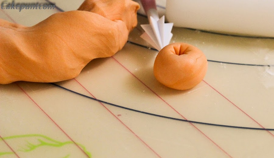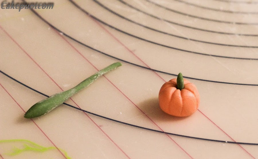 Afinar un poco de fondant verde y cortar la puntita que hará de rabito de la calabaza.
