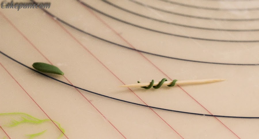 Volver a afinar, muy fino muy fino fondant verde y enrollarlo en un palillo.