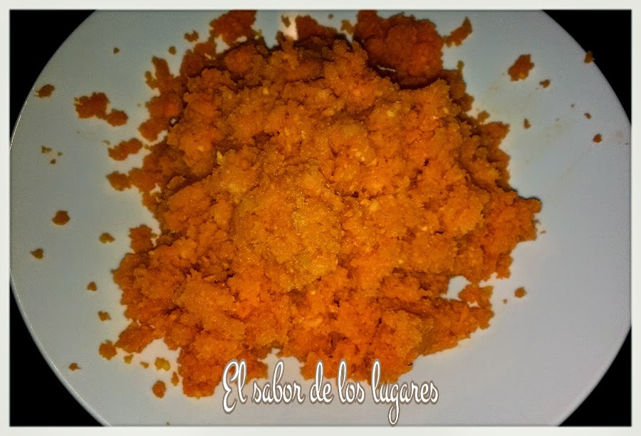 Sin lavar el vaso, tritura la calabaza y las zanahorias durante 5 segundos a velocidad 7. Baja los restos que hayan quedado en las paredes del vaso y en la tapadera y bate otros 2 o 3 segundos a la misma velocidad, debe de quedar todo bien triturado. Reserva en otro bol.