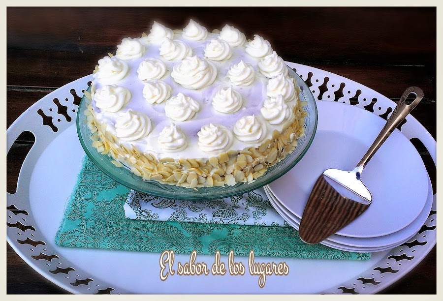 Pasado este tiempo, saca la tarta del frigorífico y extiende el resto del frosting por toda la superficie y los laterales. Decora con la manga pastelera la superficie de la tarta y con almendras laminadas los laterales.