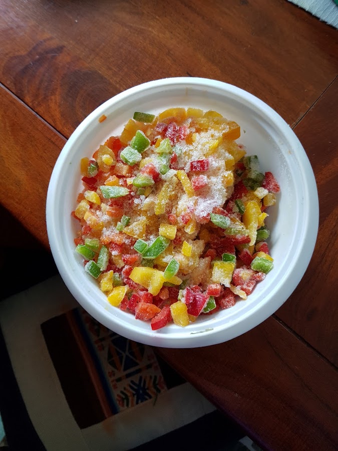 *usé 1 cebolla blanca, un poquito de morrón picado (yo usé tres colores que siempre tengo en el freezer)