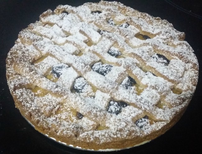 - Con el resto de la masa, corta tiras con un cuchillo y formamos una rejilla encima del relleno de la tarta.