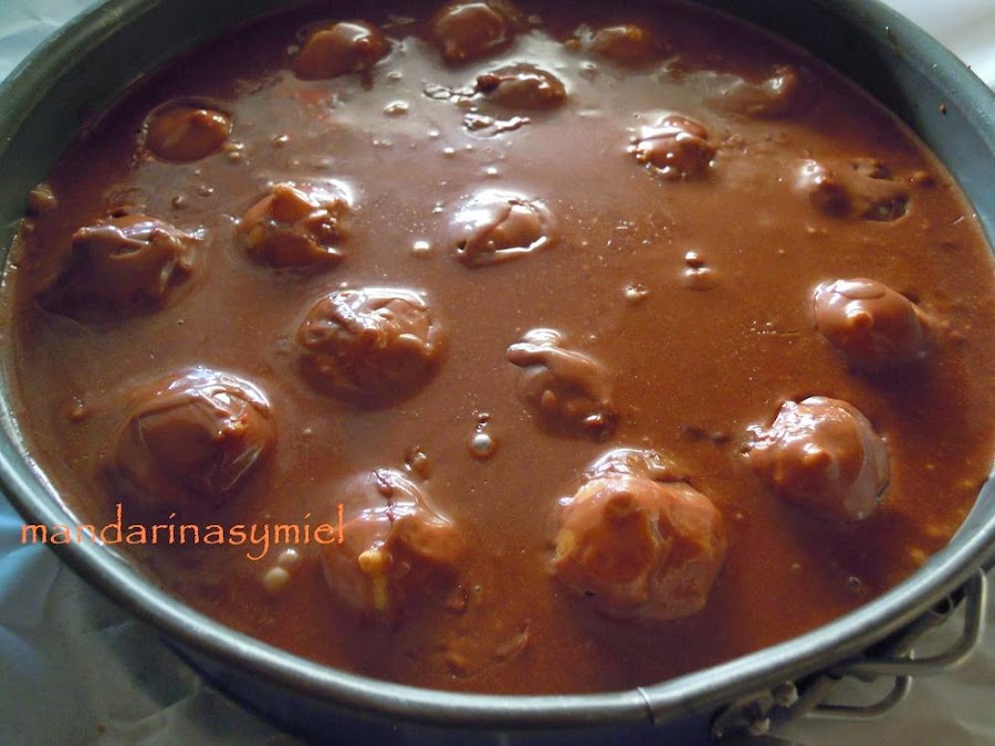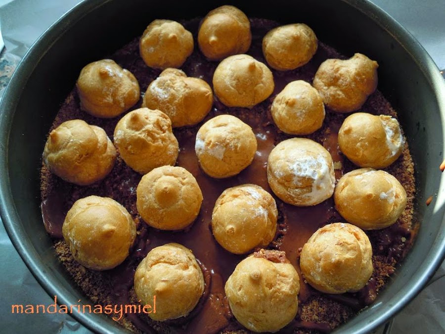 Cuando se haya enfriado un poco el flan, échalo sobre los profiteroles y deja que se enfríe, mete en la nevera.