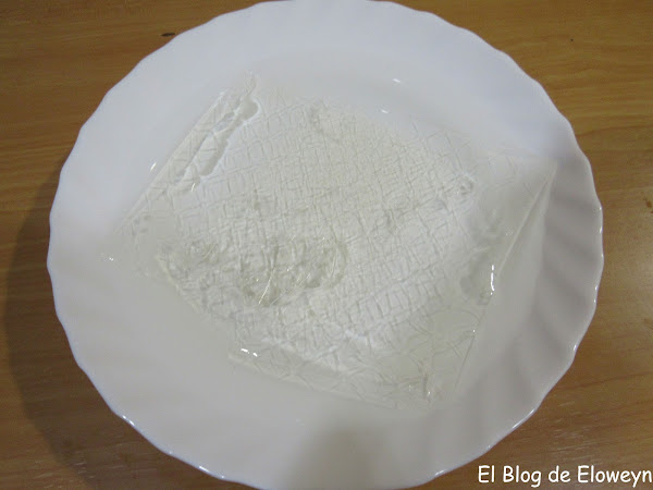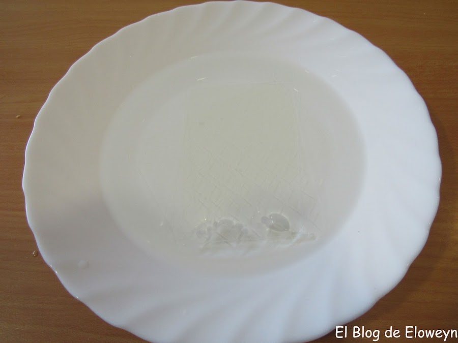 Ponemos las tres láminas de gelatina a remojar en un plato con agua fría.