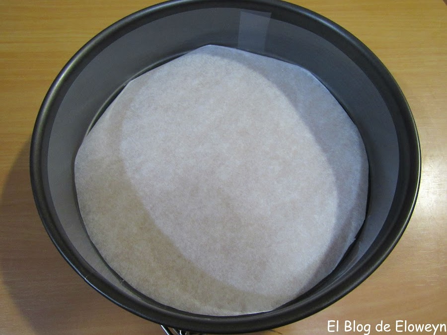 A continuación, ponemos papel para hornear en la base. No vamos a hornear la tarta. De hecho, la cinta de acetato NO se puede meter en el horno. El papel para hornear es simplemente para que luego podamos sacar más fácilmente las raciones y no se nos peguen en la base. Lo recortamos más o menos del tamaño de la base.