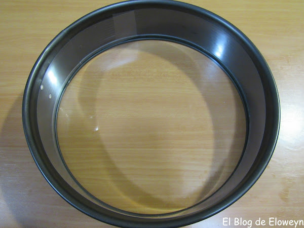 Primero de todo necesitamos un molde desmontable de unos 23 cm. de diámetro. Sale una tarta bastante grande. A continuación, y esto es opcional, ponemos alrededor de las paredes del molde una cinta de acetato (o PVC). De esta forma será más fácil desmoldar la tarta y quedará mucho mejor acabada que si no se lo ponéis. Para los que no tengáis y queráis comprar la cinta, podéis conseguirla en Internet por Amazon, o en tiendas especializadas de repostería. Las venden en rollos. No os preocupéis. No se echa a perder y así, otra vez que queráis hacer otra tarta del mismo estilo ya tendréis la cinta y la tarta os quedará estupenda. Os pongo una foto del molde con la cinta de acetato puesta. Es un molde con una base de vidrio: