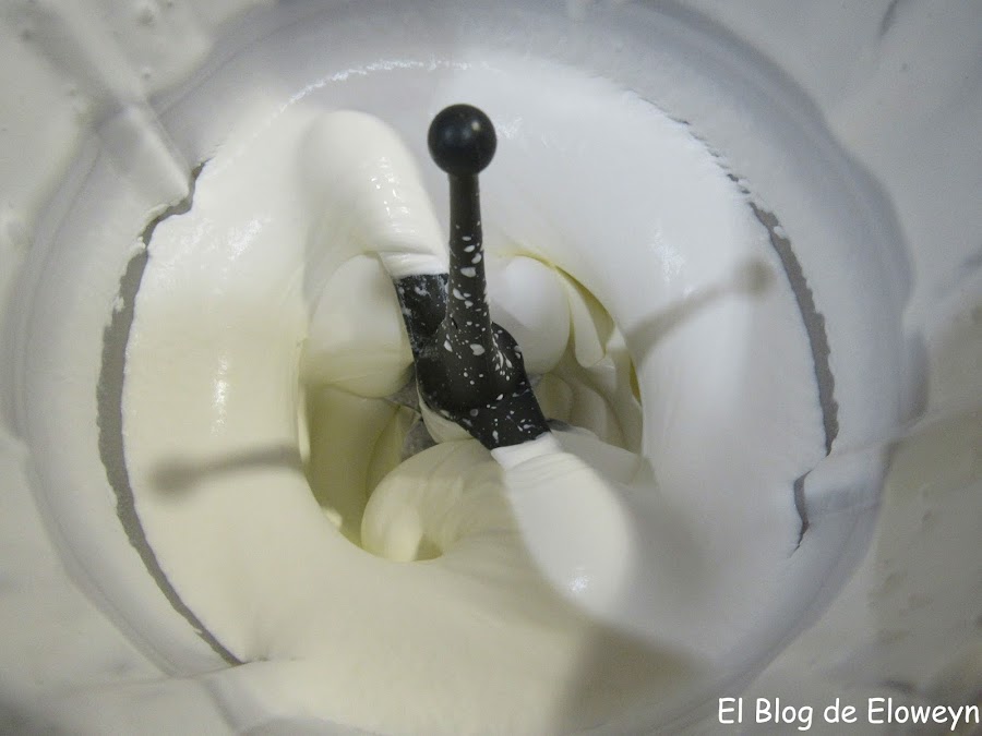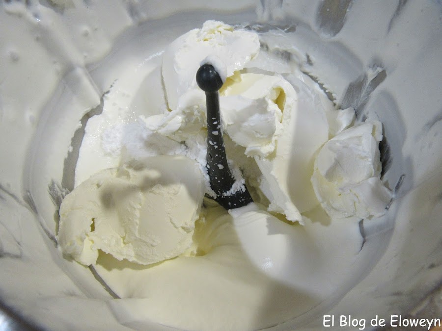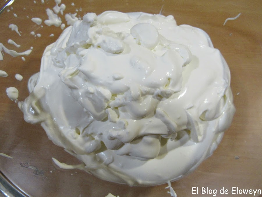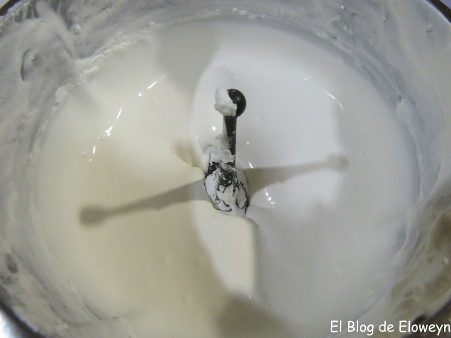 Montamos la nata (crema de leche) a velocidad 3 y 1/2. No hace falta que esté bien montada. Id vigilando porque si os pasáis, la nata (crema de leche) se os convertirá en mantequilla. Tiene que quedar más o menos así: