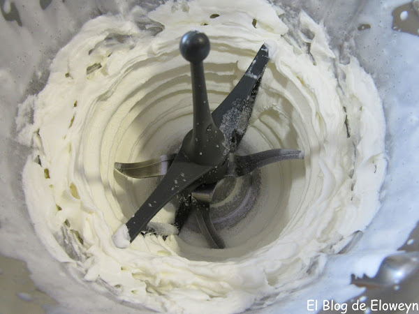 Montamos la nata (crema de leche) programando la Thermomix a velocidad 3 y medio sin tiempo. Id vigilando por el bocal, y cuando veáis que la nata (crema de leche) ya está bien montada, parad la máquina. Como siempre, no os despistéis o tendréis mantequilla en lugar de nata montada (crema de leche).