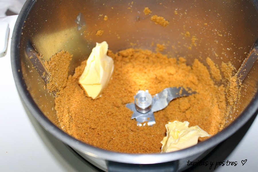 Triturar las galletas 10 segundos a velocidad 7-10, añadir 30 gr. de mantequilla fría y mezclar 10 seg. vel.6. Colocar sobre un molde desmoldable y