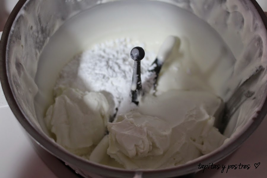 Cuando tengamos la nata (crema de leche) semi montada, añadimos el azúcar glass y el queso. mezclamos todo y reservamos en un bol.