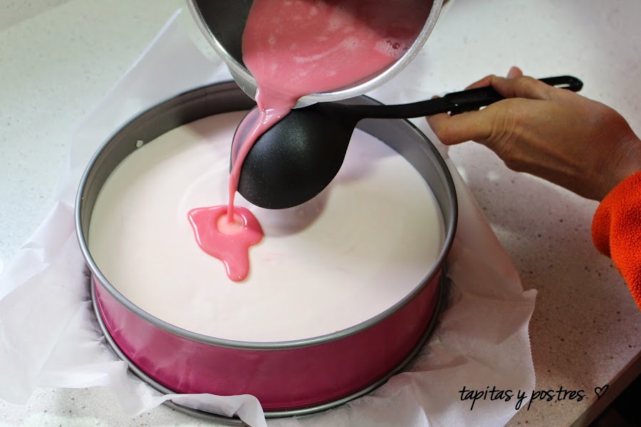Dejamos que se enfríe la cobertura un poco antes de volcarla sobre la capa anterior con cuidado. usad un cucharón al revés. Ahora de nuevo a la nevera hasta que solidifique, es mejor preparar la tarta el día antes.