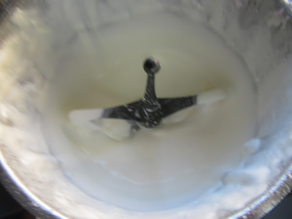 2- Sin lavar el vaso, colocar la mariposa y semi-montar la nata (crema de leche) unos segundos a vel. 3 1/2 ,(No es necesario montarla del todo).