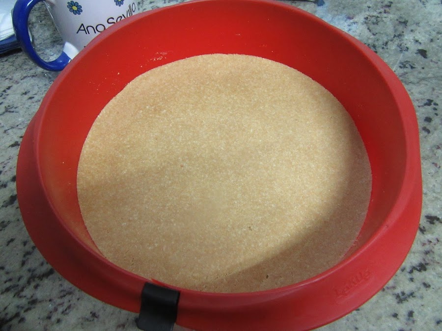 1- Colocar la base de bizcocho en un molde desmontable (24 cm), apretar bien ó bizcocho genovés finito ó triturar 200 gr de galletas con turbos, añadir 100 gr. de mantequilla fría y mezclar 10 seg. vel.6.