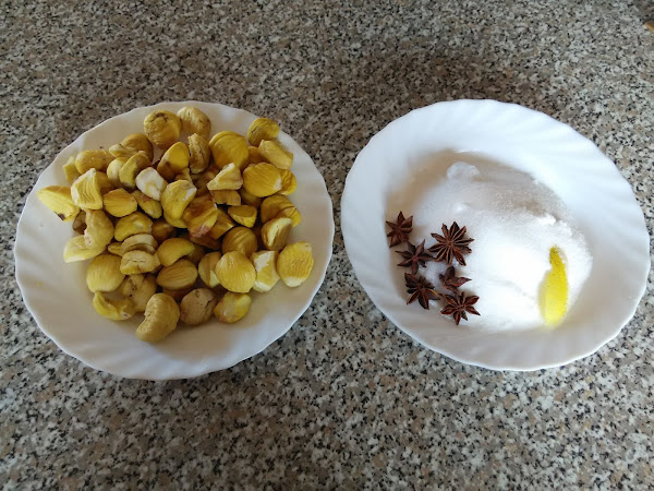 Una vez las castañas estén peladas, se cortan en trozos pequeños, se pone el agua a hervir junto con el anís, la cáscara de limón y la rama de canela. Una vez hierva, se adiciona el azúcar y en cuanto esté totalmente disuelto se añaden las castañas. Se baja la temperatura del hornillo y se remueve cada cierto tiempo hasta que las castañas estén blandas y el agua se haya convertido en almíbar.
