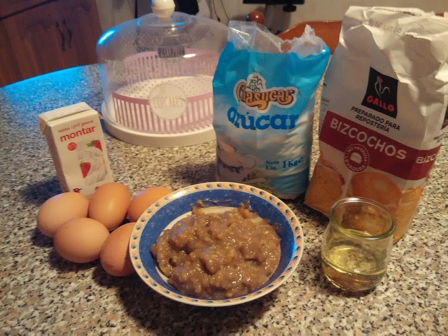 Por otro lado se mezclan las yemas con el azúcar, hasta que la mezcla duplique su tamaño; se añade poco a poco el aceite (integrándolo bien con las varillas), se añade la nata (crema de leche) y por último la crema de castañas. Ahora es el momento de añadir la harina, que debe de haberse tamizado previamente. Por último solo queda integrar las claras montadas poco a poco y con movimientos envolventes, para evitar que se bajen.