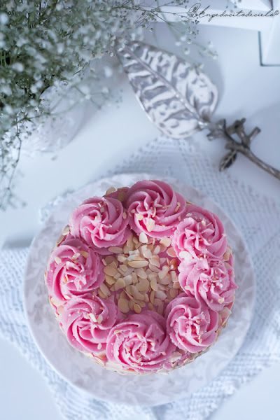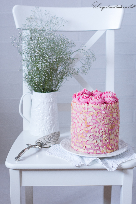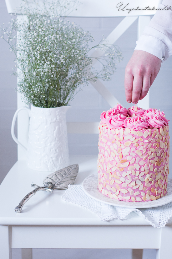 Por último y con muuuucha paciencia, vamos cubriendo con la almendra fileteada, para rematar podemos hacer unos rosetones en la parte de arriba con la crema y espolvorear con la almendra.