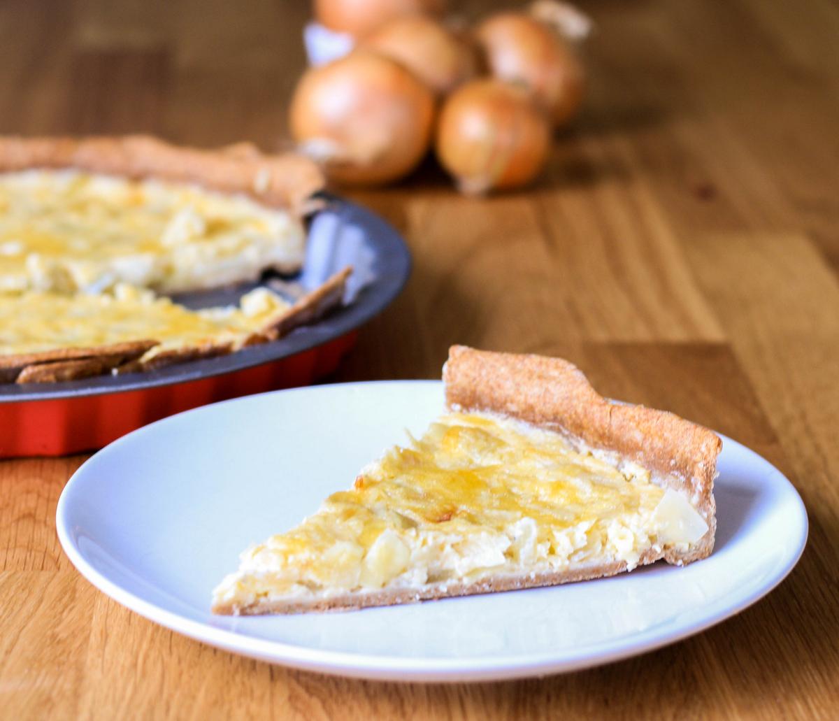Tarta de cebolla y queso con masa integral, súper fácil y económica. Ideal para usar lo que tengamos en la heladera.