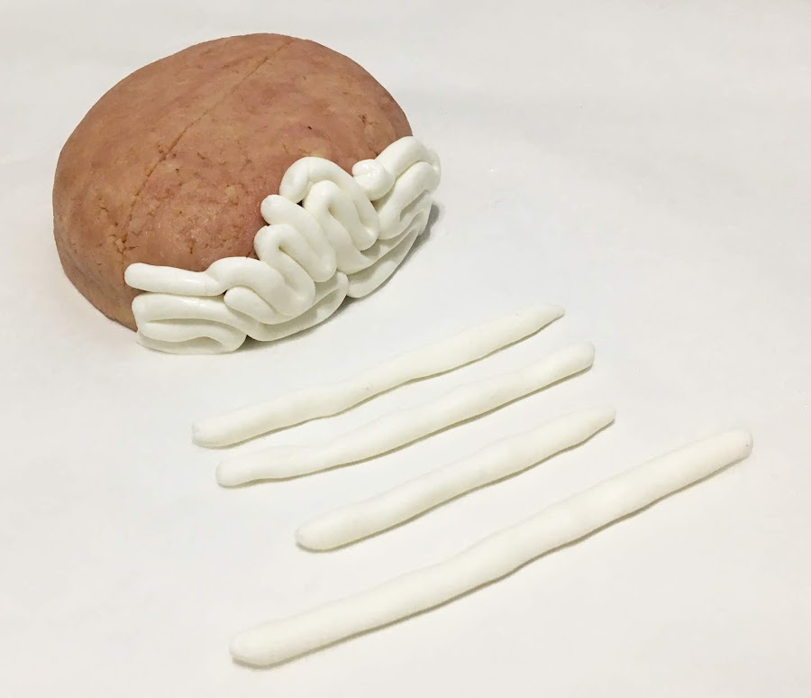 - Amasa un poco el fondant y comienza a hacer tiras de diferentes largos pero con el mismo grosor.