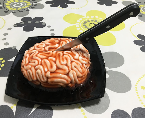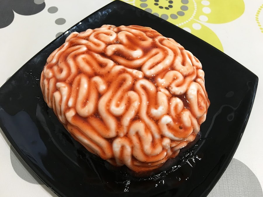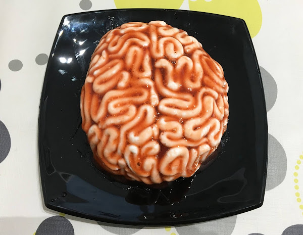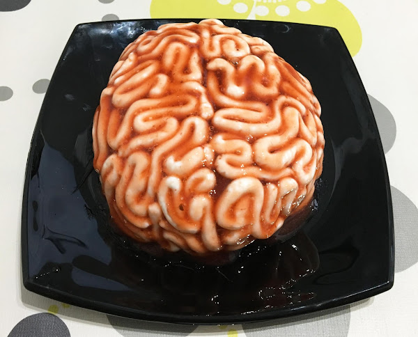 - Vierte sirope de fresa en un bol y comienza a extenderlo por todo el cerebro con ayuda de un pincel de cocina, haciendo más hincapié en la zona central, para que parezca sangre.