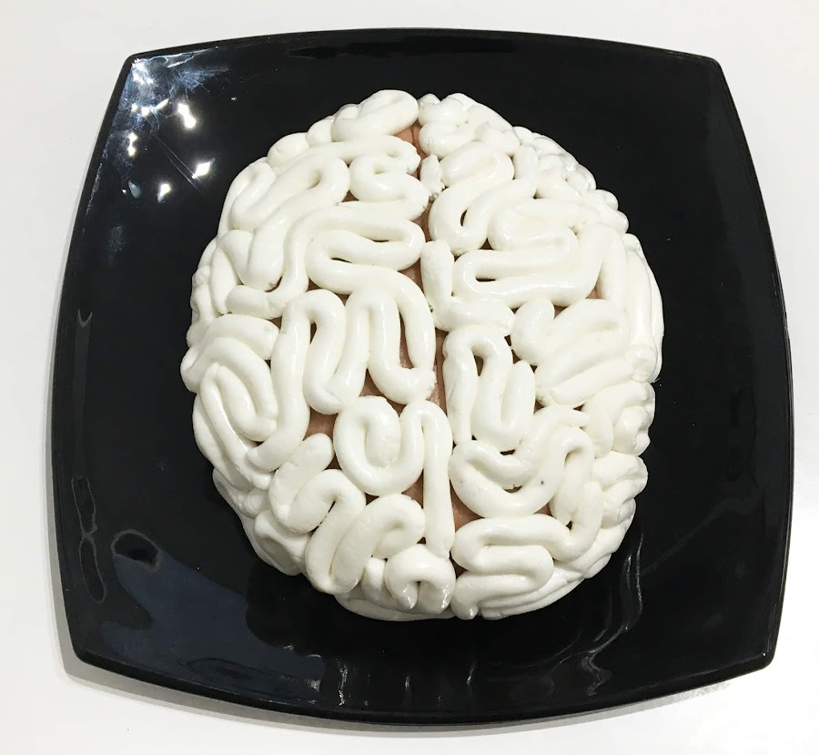 - Una vez se haya enfriado, desmoldamos y aplastamos el bizcocho un poco por los lados para darle la forma del cerebro.